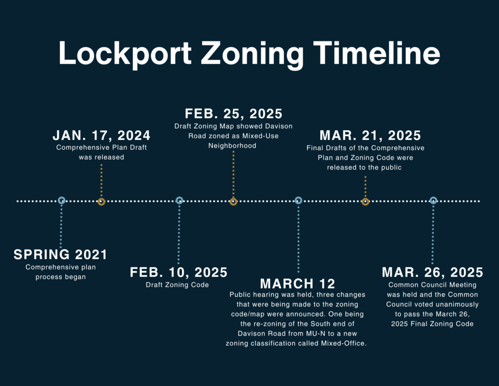 Davison Road Estates was proposed in good faith, with a plan that aligned with the Village’s own long-term goals. But shortly after submission, the zoning rules were abruptly changed, effectively shutting the project down before it could move forward. These last-minute changes were not part of a broader plan or community input, they were reactionary, and they block the kind of development Lockport says it wants.